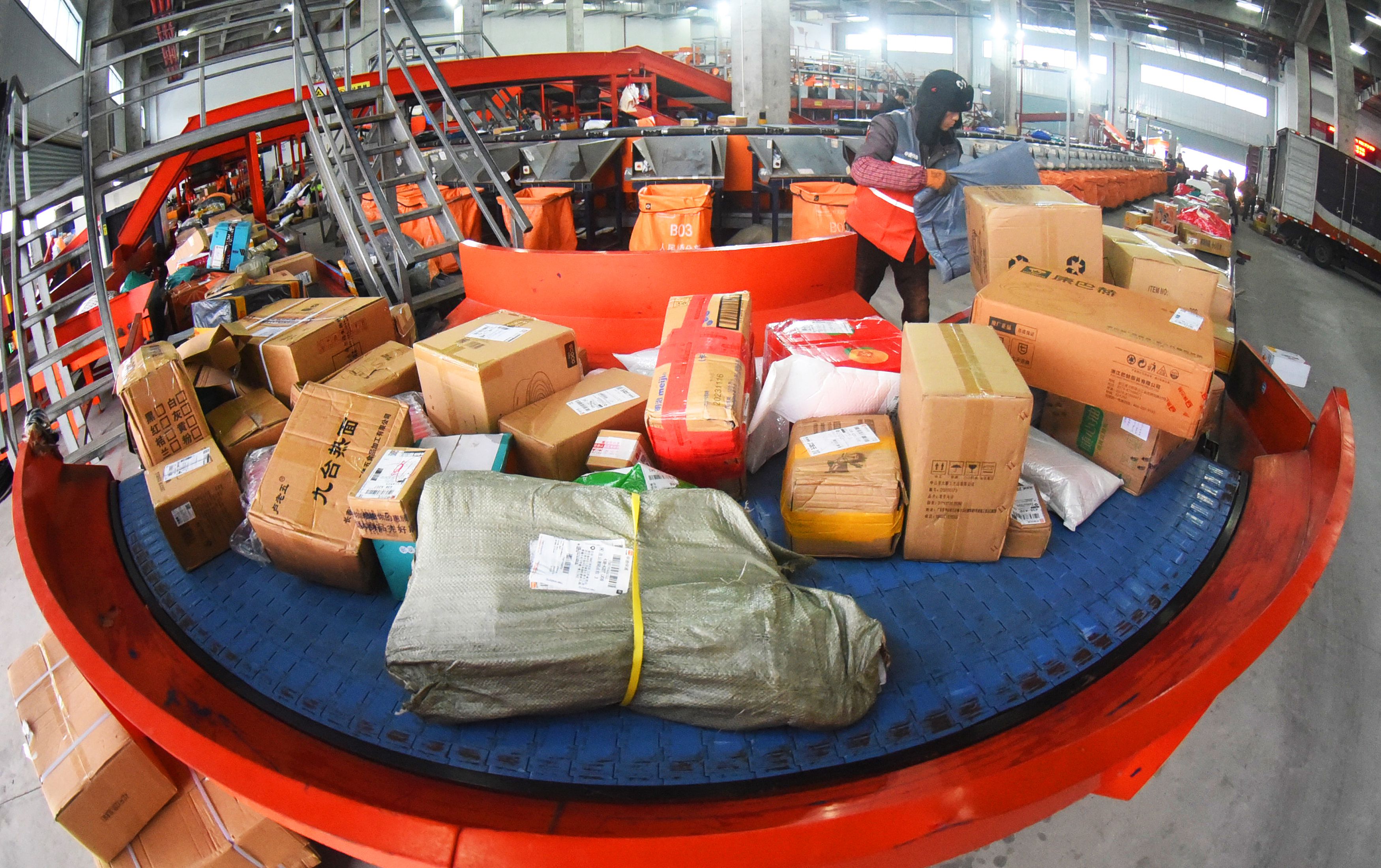 △ 2024年2月5日,江苏省连云港市公用配送中心一家快递公司工作人员正在加紧分拣、发送快递包裹。