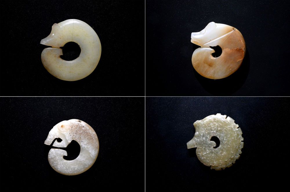 这是在殷墟博物馆新馆内展出的龙形玉玦(拼版照片,1月9日摄)。