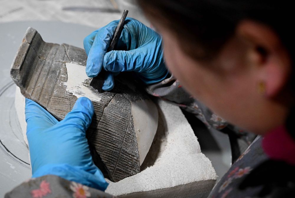 在中国社会科学院考古研究所安阳工作站,工作人员在对殷墟洹北商城出土的陶片进行整理修复(2月23日摄)。