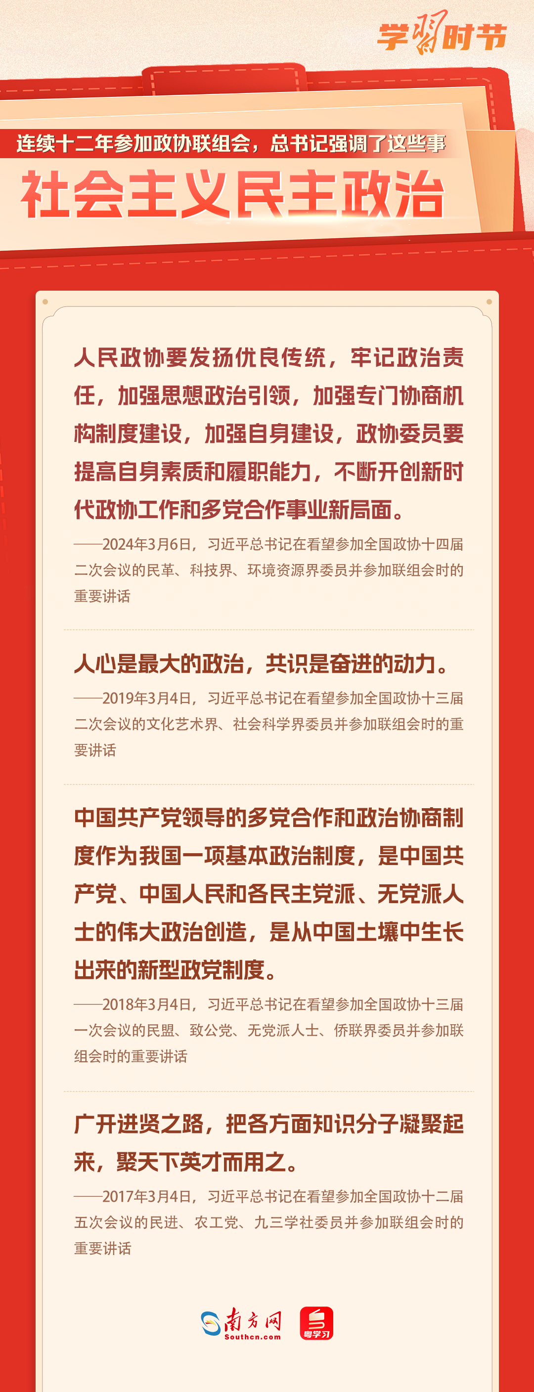 中国共产党领导的多党合作和政治协商制度是我国的一项基本政治制度。党的十八大以来,习近平总书记每年都参加政协联组会,对社会主义民主政治、民营经济、自主创新、乡村振兴、社会保障、文化自信、国家统一等作出重要论述,让我们一起重温金句!