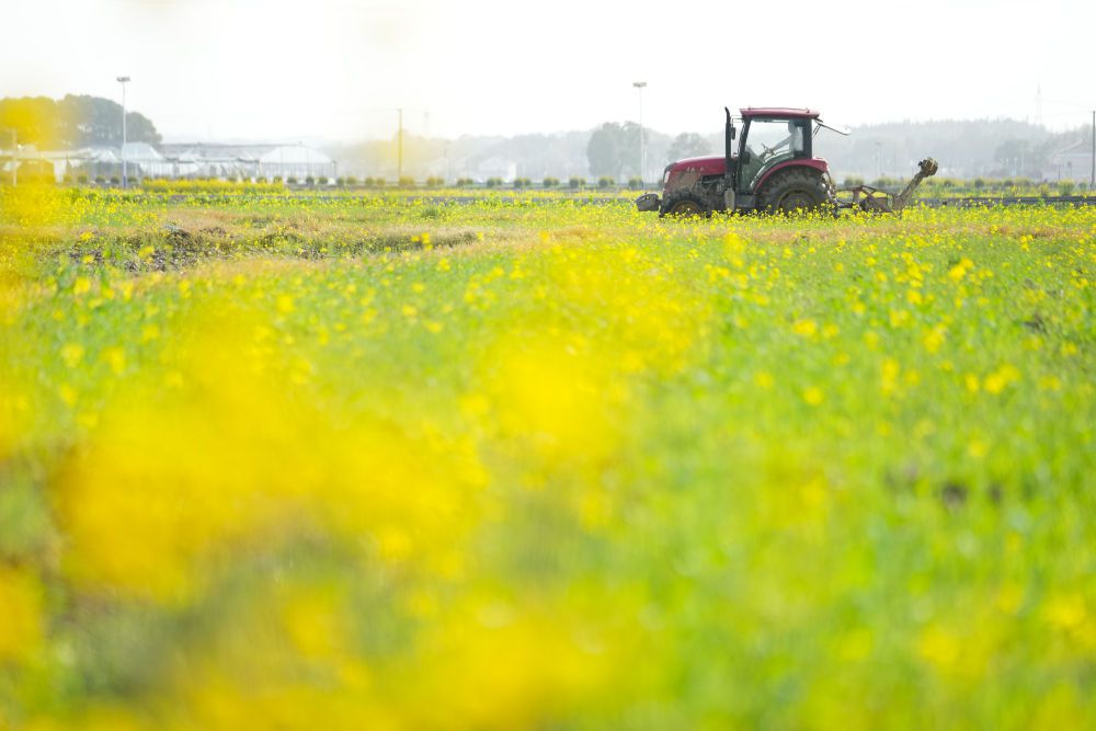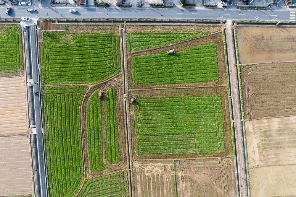 3月19日,在港中坪村,村民驾驶农机翻耕田地(无人机照片)。