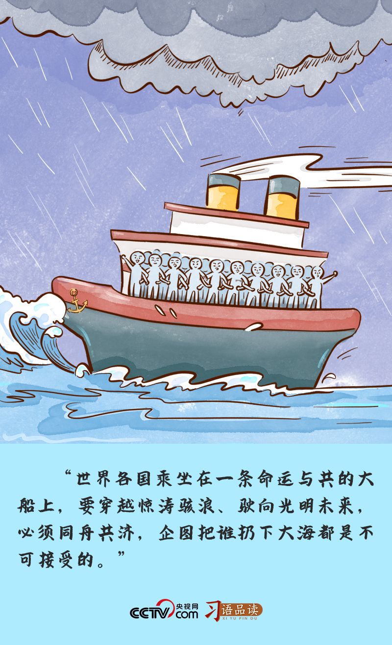 2022年1月17日,在2022年世界经济论坛视频会议上,习主席深刻阐释“小船”和“大船”的关系:“各国不是乘坐在190多条小船上,而是乘坐在一条命运与共的大船上。小船经不起风浪,巨舰才能顶住惊涛骇浪。”
