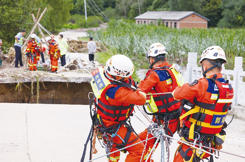 2023年夏,面对影响华北、黄淮、东北等地的严重汛情,在以习近平同志为核心的党中央坚强领导下,广大党员干部为守护人民生命和财产安全挺身向前,千千万万人民群众为保卫家园顽强奋战。图为8月6日,吉林省吉林市消防救援支队队员利用绳桥解救受困村民。 新华社记者 颜麟蕴/摄