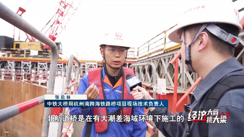 中铁大桥局杭州湾跨海铁路桥项目现场技术负责人 张后林:北航道桥是在有大潮差海域环境下施工的,潮差最大能达到8.5米,我们要克服复杂的地质环境,经过地勘,表面都是淤泥质粉质黏土,很容易在钻孔桩施工过程中塌孔。
