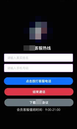 点击链接后,便跳转到了某平台客服热线页面,页面上要求填写名字、电话,还有拨打客服电话、结束通话、下载会议APP等按键。因之前看到过此类骗局,马上退出了界面,未遭受损失。