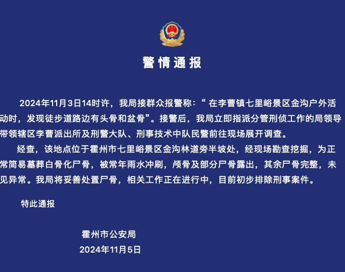 经查,该地点位于霍州市七里峪景区金沟林道旁半坡处,经现场勘查挖掘,为正常简易墓葬白骨化尸骨,被常年雨水冲刷,颅骨及部分尸骨露出,其余尸骨完整,未见异常。我局将妥善处置尸骨,相关工作正在进行中,目前初步排除刑事案件。