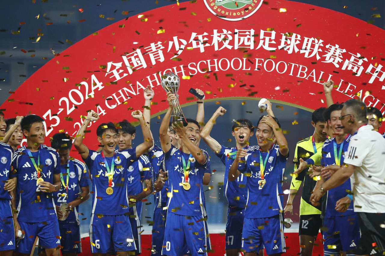 大连市第八中学队获得今年全国青少年校园足球联赛高中男子组冠军,图为队员们站上领奖台庆祝。 图源:新华社