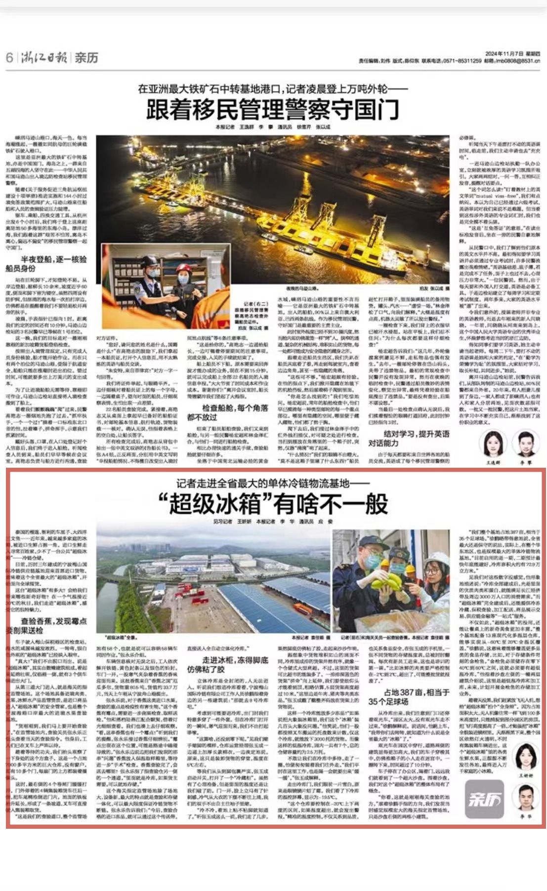 “真大!”我们不由脱口而出。说是“超级冰箱”,其实由数幢建筑组成,看起来延绵壮观,仅临港一侧,就有3个供车辆进出大门。