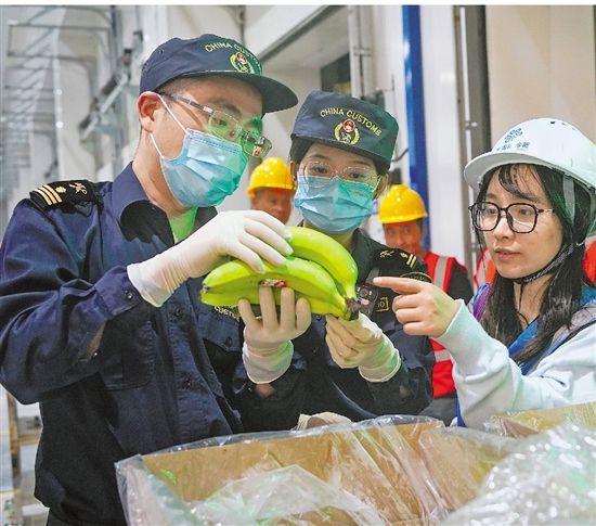 记者(前右)和海关关员一起查验香蕉。本报记者 袁佳颖 摄