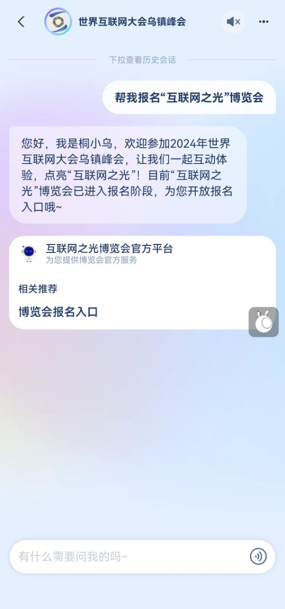 为全面提升观众参会观展体验,今年博览会推出了一款集多种功能于一身的智能体,这款智能体化身为百事通,不仅能够帮助参会者了解乌镇会议议程、“互联网之光”博览会展区信息、出行和观展信息,带领观众前往对应的展区展厅,寻找附近的功能服务点位,还能为游客推荐餐饮美食和酒店信息,解决各种生活难题。此外,智能体还提供了丰富的互动体验,如打卡活动、收藏展位、交换名片等,简单“碰一下”,让用户轻松享受智能生活。