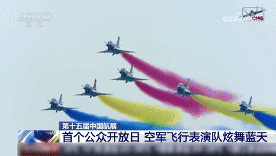 伴随着阵阵轰鸣声,六架战机如离弦之箭,刺破长空。从跃升到散开,飞机在空中绘出完美弧线,六条彩色烟带从机尾喷出。有着“空中仪仗队”美誉的“八一”飞行表演队,以一系列高难度动作,拉开了本届中国航展飞行表演的序幕。