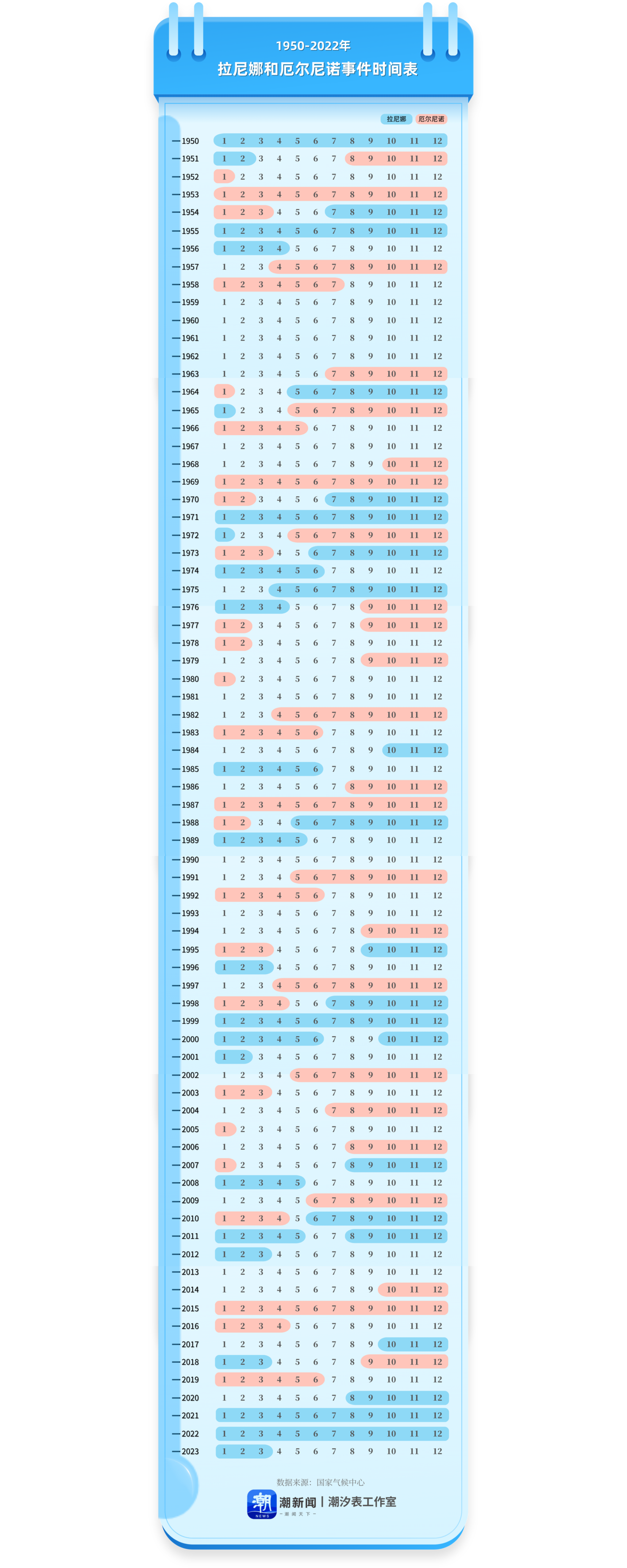 厄尔尼诺和拉尼娜似乎喜欢上演“天气接力赛”,通常在一次强烈的厄尔尼诺之后,拉尼娜会随之而来。例如,1972-1973年、1997-1998年和2009-2010年之后,拉尼娜都如约而至;不过,这并不是绝对的,比如1991-1992年和2002-2003年的厄尔尼诺之后就没有出现拉尼娜。