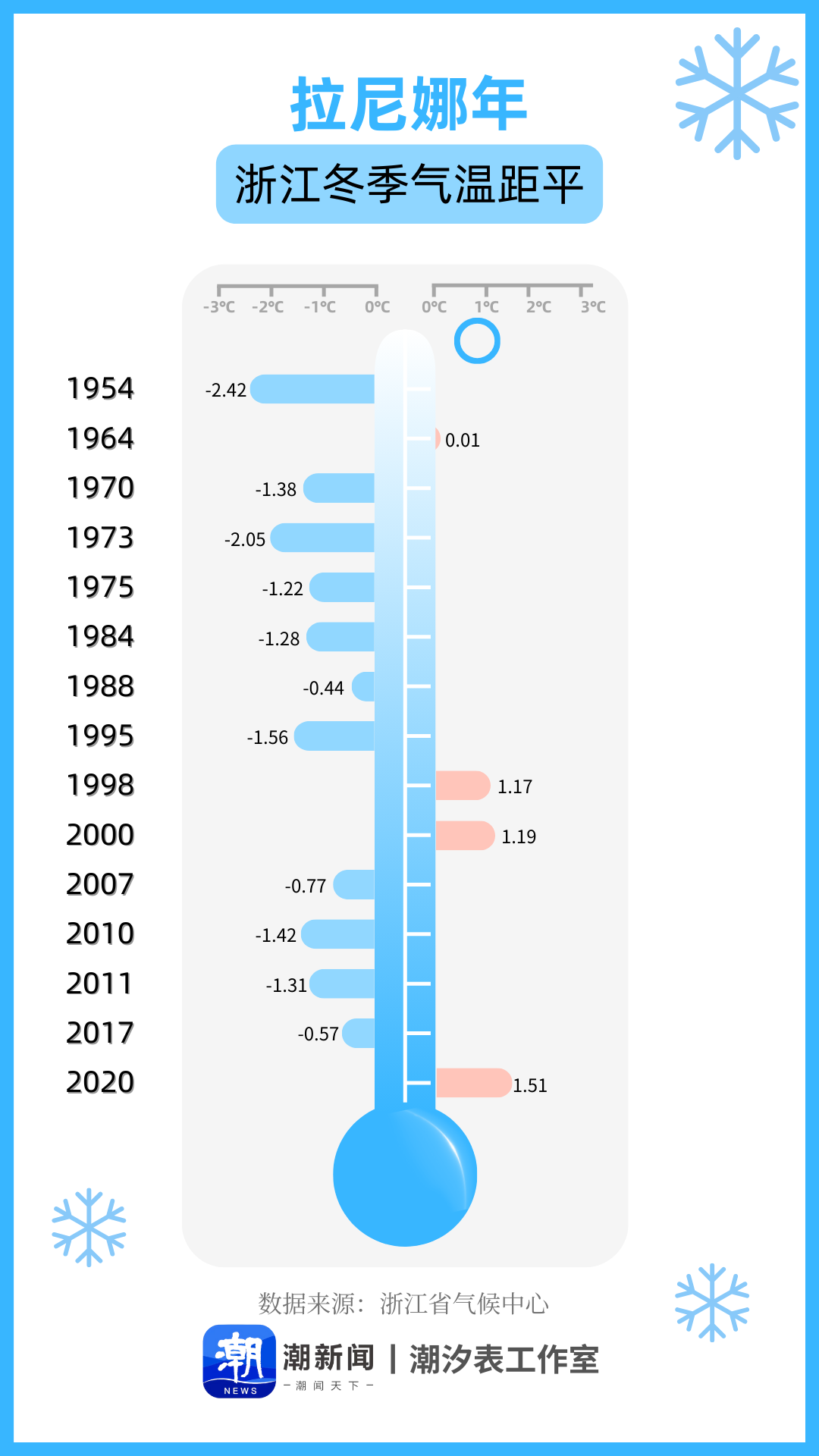 1951年以来的15个拉尼娜年中,浙江冬季有11个年份气温偏低,占比近四分之三。统计结果表明,拉尼娜当年的冬季,浙江气温出现偏低的概率较大,但由于全球气候变暖,对拉尼娜有抵消作用,因此拉尼娜年冬季气温偏高还是偏低还要看拉尼娜的强度以及冬季极地冷空气的强度和影响路径。