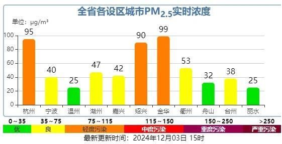 据杭州市气象台介绍,污染物是由北方输送而来——在高压系统的影响下,大气的扩散能力差,这些污染物不断聚集,导致了浓度攀升。近期,大家要适当减少户外锻炼,敏感人群出门需做好健康防护。
