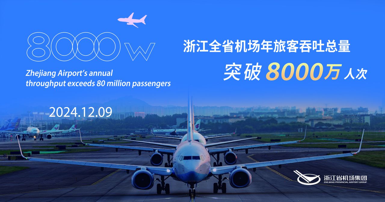 截至12月9日,浙江全省机场2024年的旅客吞吐量已突破8000万人次,浙江省机场集团正式迈入8000万级机场集团方阵,实现新的跨越式发展。