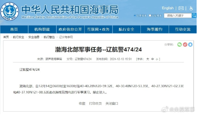 据中国海事局网站消息,葫芦岛海事局发布航行警告,12月14日6时至16时,渤海北部部分海域进行军事演习,禁止驶入。