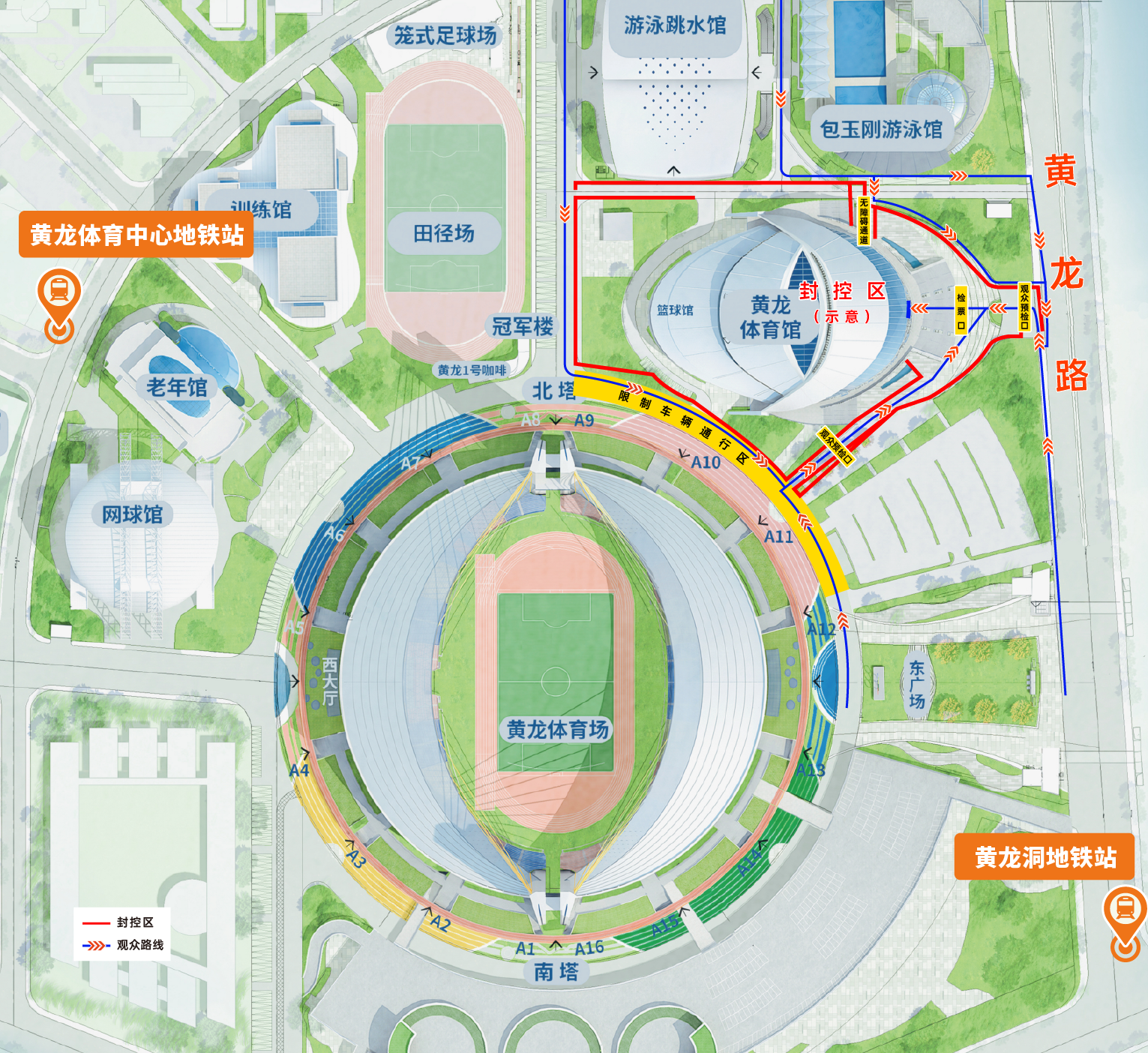 3号线、10号线黄龙体育中心站B、F口3号线黄龙洞站B、C口。