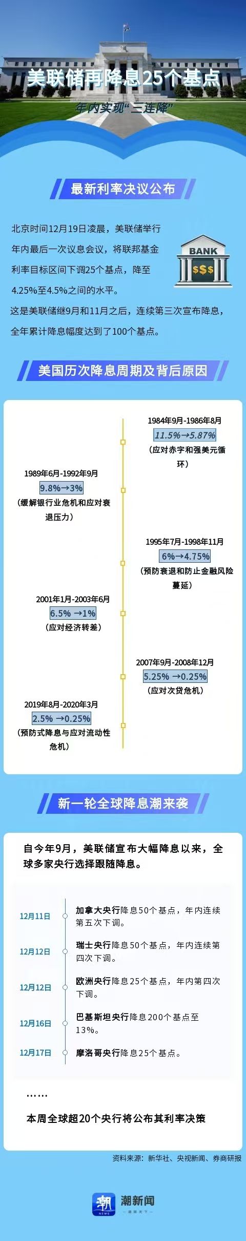 据央视新闻消息,美国联邦储备委员会当地时间12月18日宣布,将联邦基金利率目标区间下调25个基点到4.25%至4.50%之间,符合市场普遍预期。
