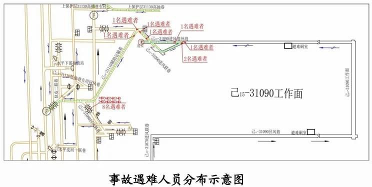 事故发生后,开拓队其他12人中,自行升井2人,在己14-31110进风巷外段风门处晕倒后获救2人,遇难8人(二部和四部皮带输送机头附近各4人);通风队在己14-31110辅助运输巷上平台附近的13人中,遇难8人(己15-31090回风斜巷风门间),自行脱险或获救5人(己15-31090回风斜巷风门间晕倒后获救2人、到达己14-31110回风巷与东翼运矸巷交叉口处脱险1人、从己15-31090片盘风门跑出脱险2人);1月12日八点班其他人员均自行升井或被矿山救护队护送升井。