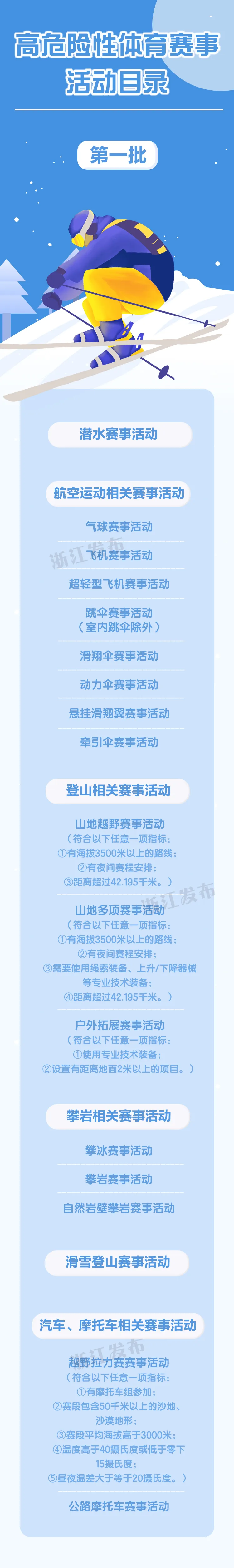 为确保高危险性体育赛事活动安全有序开展,省体育局日前印发《浙江省举办高危险性体育赛事活动分级管理实施意见(修订)》,针对潜水、航空、登山、攀岩、滑雪登山、汽车、摩托车等具有高危险性的运动项目赛事活动,建立健全安全监管工作制度,明确监管工作规范。