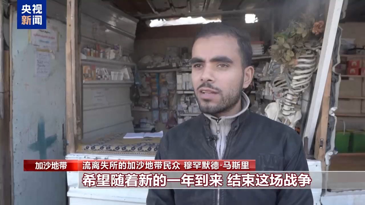 流离失所的加沙地带民众 穆罕默德·马斯里:我们在新的一年里的愿望是,希望随着新的一年到来,结束这场战争,结束对加沙的侵略。我曾经的梦想和抱负很大,尤其是在攻读研究生学位,和开展科学研究方面。这场战争毁灭了一切,希望我们能看到面向未来的希望光芒,能够重新追求一切美好的事物,摆脱战争带来的破坏。