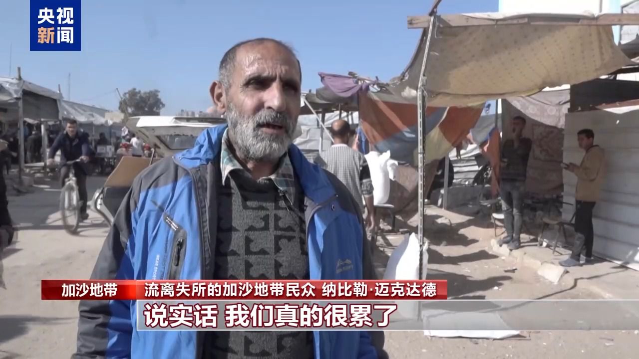 流离失所的加沙地带民众 纳比勒·迈克达德:我的愿望是能过上和平的生活,战争能停止,我们能回到自己的家园。说实话,我们真的很累了。只能住帐篷也没关系,最重要的是能够回到家园。但愿战争停止,一切苦难能够结束。