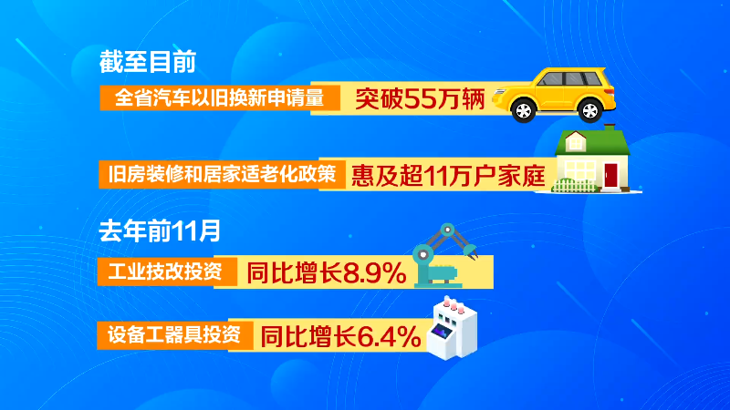 在政策组合拳强力推动下,截至目前,全省汽车以旧换新申请量突破55万辆,旧房装修和居家适老化政策惠及超11万户家庭,去年前11月工业技改投资同比增长8.9%、设备工器具投资同比增长6.4%。