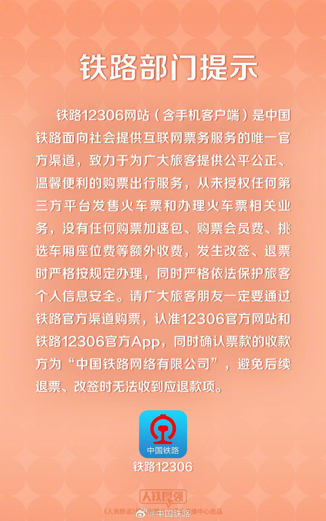 请广大旅客朋友一定要通过铁路官方渠道购票,认准12306官方网站和铁路12306官方App,同时确认票款的收款方为“中国铁路网络有限公司”,避免后续退票、改签时无法收到应退款项。