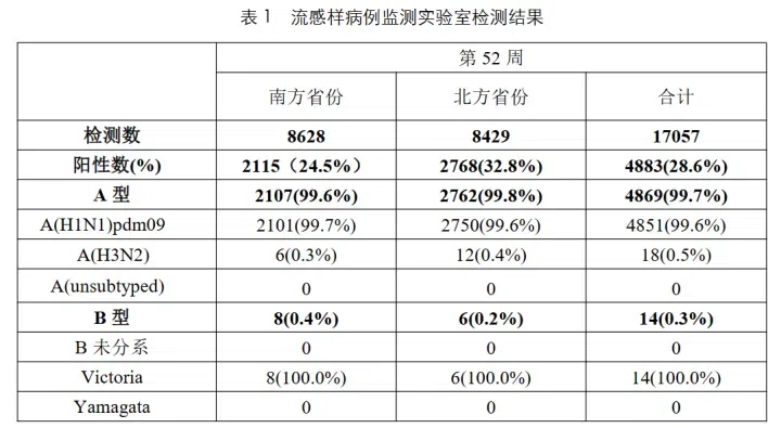 1月2日,根据中国疾病预防控制中心第52周流感监测周报显示(2024年12月23日—2024年12月29日),南、北方省份检测到的流感病毒阳性标本中,甲型H1N1流感占比99.6%。