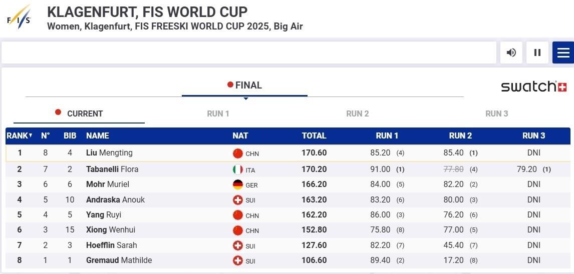 北京时间1月5日凌晨,2024-2025赛季自由式滑雪世界杯奥地利克拉根福站女子大跳台决赛,中国选手刘梦婷凭借前两轮动作获得的85.20分和85.40分,以总分170.60分,在第三轮出场前提前锁定头名,斩获首个世界杯冠军。另两位中国选手杨如意和熊文会分获第五名和第六名。