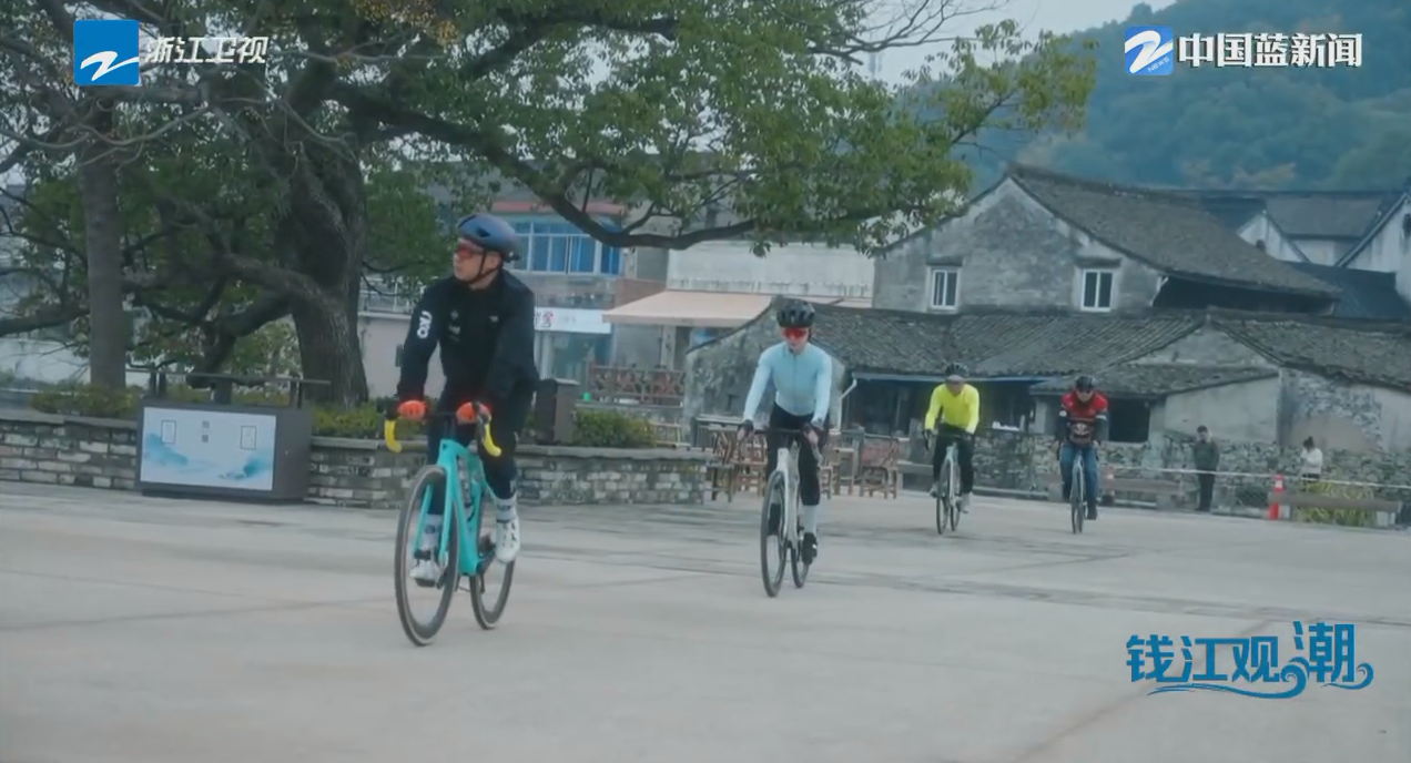 在宁波东钱湖陶麓街区,一支骑行队正在咖啡店调整自行车,准备出发。