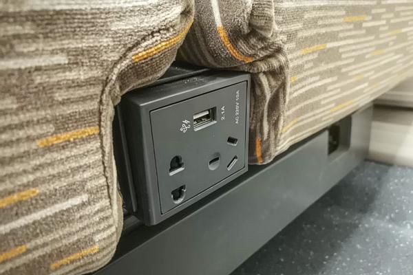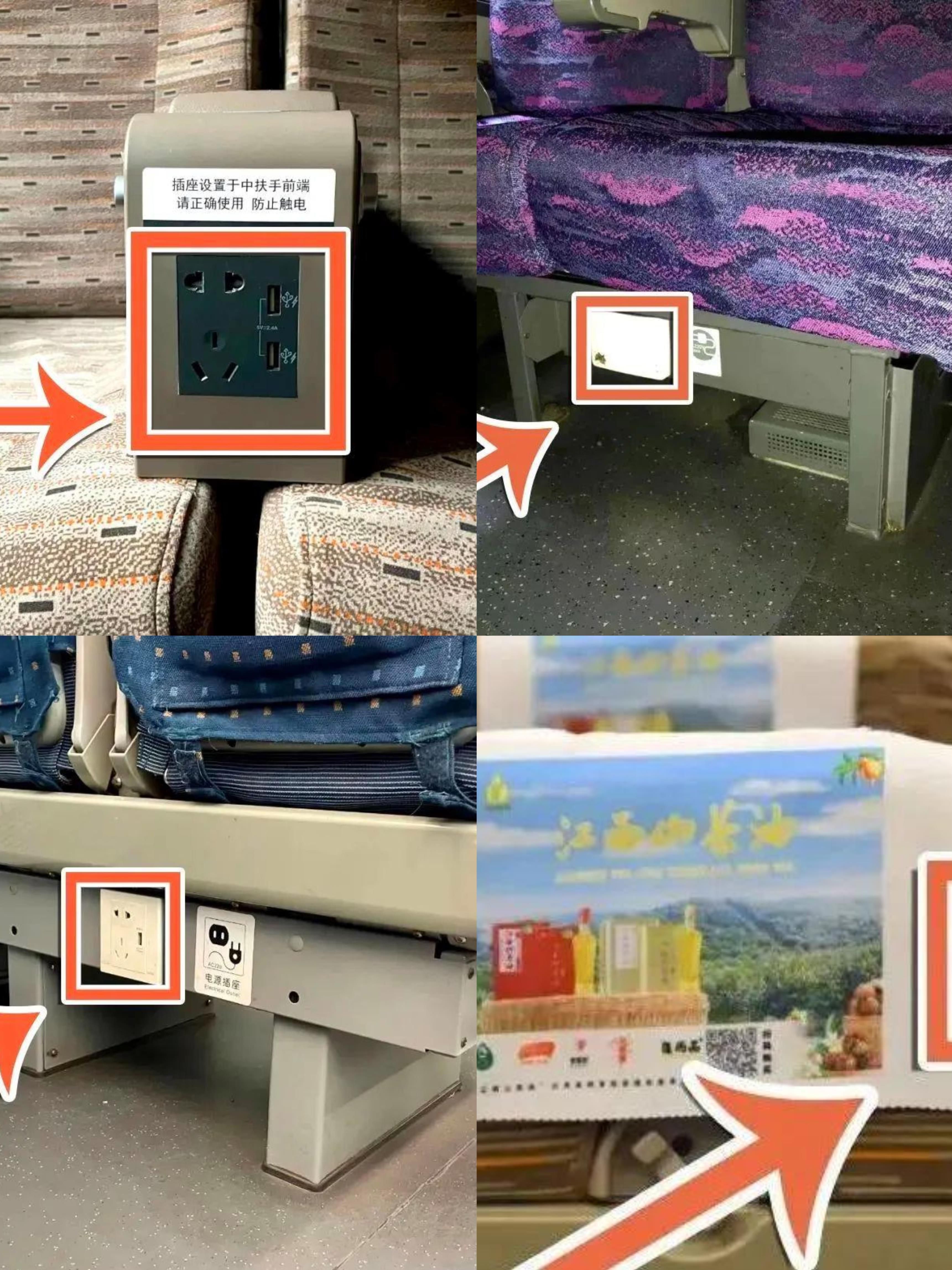由于车型、座席差异,动车组列车的充电位置也有差别,比如座椅扶手中间、两个座椅中间下方位置、座椅靠背后方、前方座椅靠背下方。