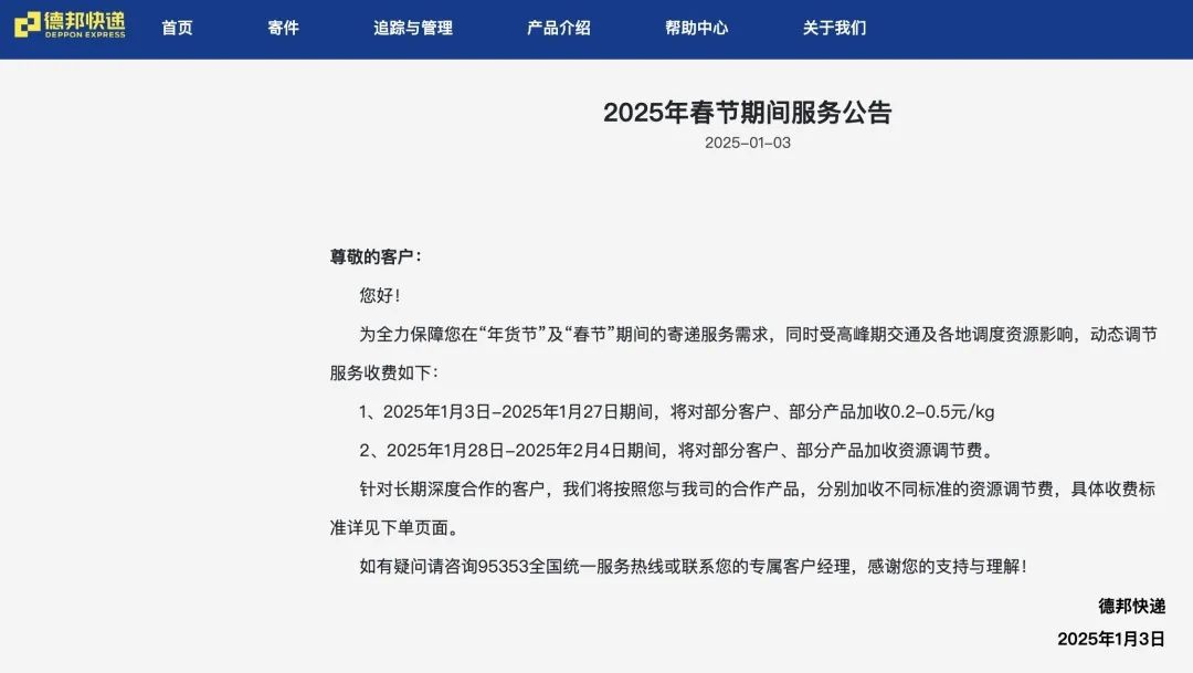德邦快递称,为全力保障您在“年货节”及“春节”期间的寄递服务需求,同时受高峰期交通及各地调度资源影响,动态调节服务收费。具体如下: