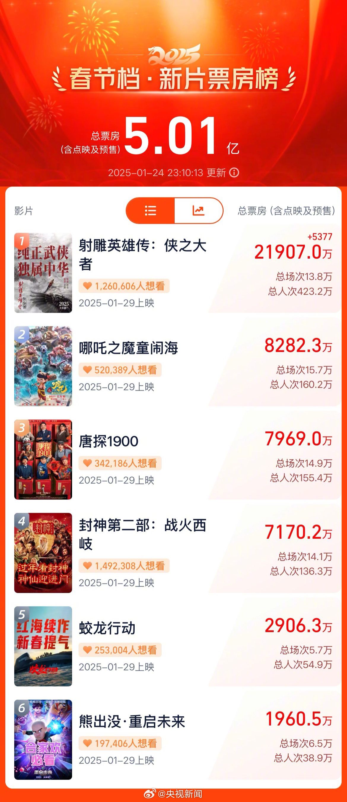 截至1月24日22时45分,2025年春节档上映新片预售总票房突破5亿。