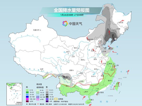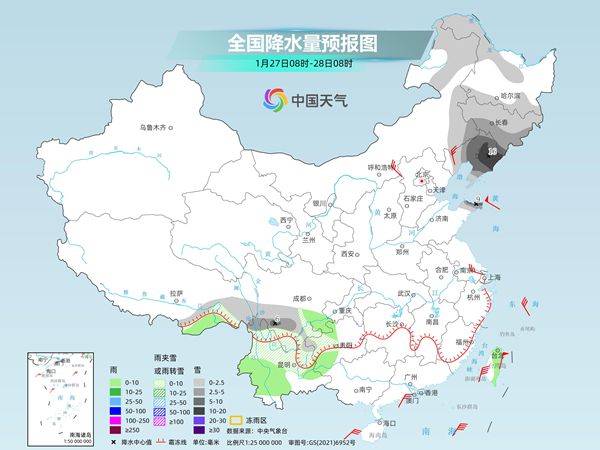 后天,内蒙古东北部、黑龙江西北部和南部、吉林、辽宁、山东半岛、西藏东南部、川西高原南部、云南北部、贵州西部等地部分地区有小到中雪或雨夹雪,其中,辽宁中东部、山东半岛北部、川西高原南部等地部分地区有大雪,局地暴雪。西藏东南部、云南西南部、四川东南部、贵州西南部、台湾岛北部和东部等地部分地区有小雨。