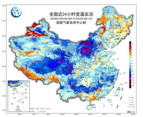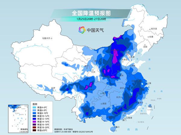 中央气象台今天夜间继续发布了寒潮黄色预警,预计25日20时至27日20时,西藏东北部、川西高原北部、内蒙古中东部、西北地区东部、华北西部和北部、黄淮中西部、江淮、江南大部、华南中西部、云南中东部等地气温将下降8~12℃,其中,内蒙古中部、陕西中南部、山西中北部、河南西部、川西高原北部等地部分地区降温幅度可达14℃以上。