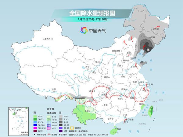 明天夜间到后天,内蒙古东部、东北地区、河北东北部等地部分地区有小雪或雨夹雪,其中,内蒙古东南部、吉林中东部和西部、辽宁、山东半岛等地部分地区有中到大雪,辽宁中北部和东部等地局地暴雪。
