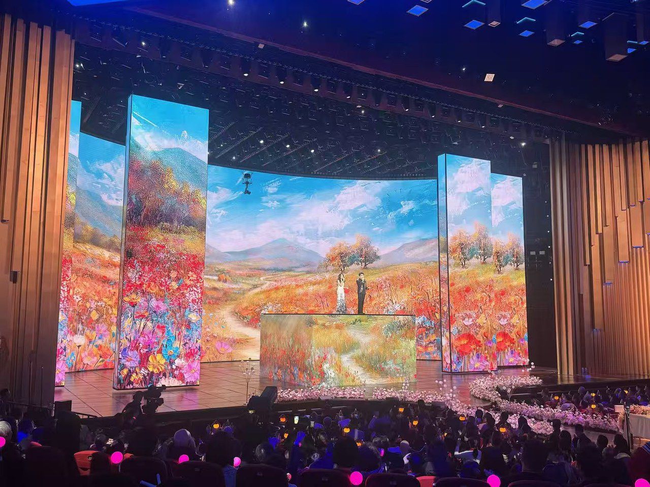 作为舞台视觉设计的点睛之笔,大丰的智能舞屏矩阵以灵活多变的形式,将舞台意境展现得淋漓尽致。四块智能舞屏作为大丰的拳头产品,今年依然是春晚舞台耀眼的亮点,每块翻转屏均能独立平移和旋转,并在轨道运行时保持动态流畅与精准。通过四面对开、全场对穿的独特设计,四块平移旋转LED屏与表演和背景画面完美结合,营造出特定的艺术氛围。