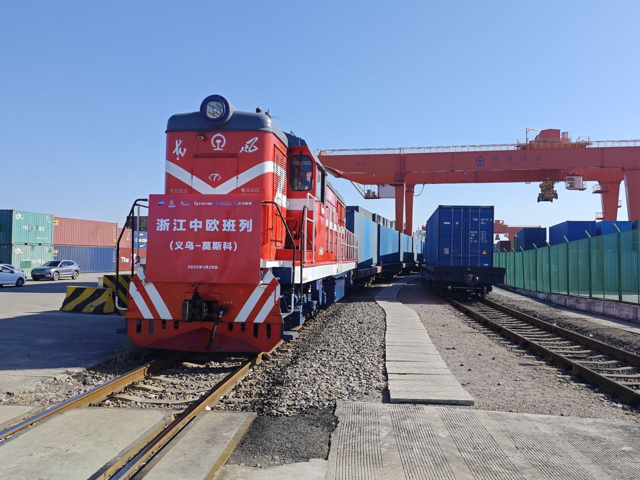 潮新闻记者了解到,班列将经二连浩特口岸出境,最终抵达俄罗斯莫斯科,这趟班列是农历乙巳年长三角开出的首趟中欧班列。