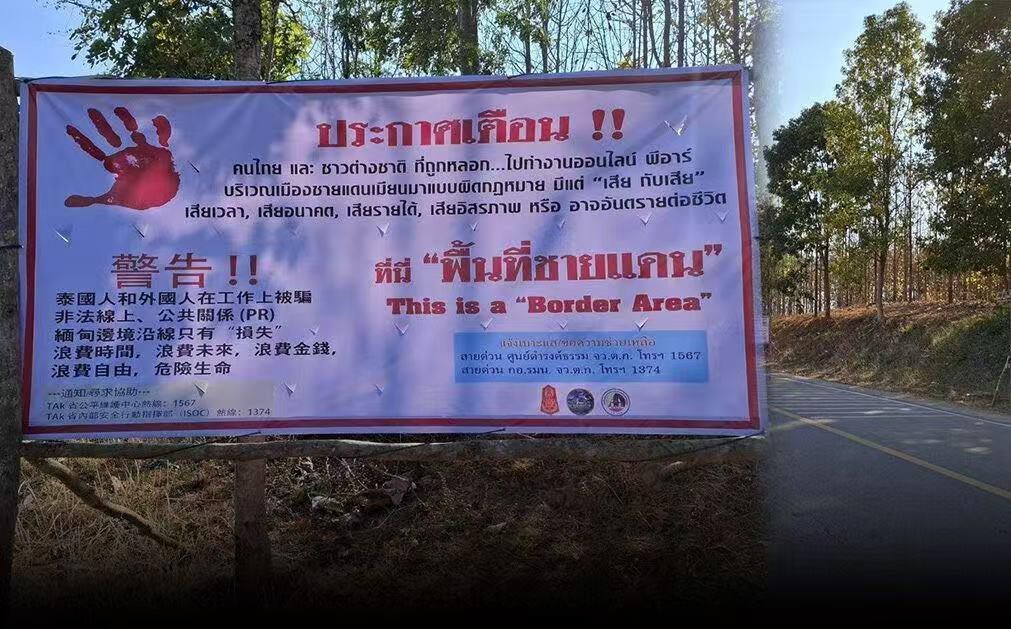 泰国军方在泰缅边境主要通道及边境检查站设置中文、泰文和英文三种语言的警示牌 ,提醒泰国人和外国人在前往边境地区时,警惕电信诈骗陷阱。图源央视新闻