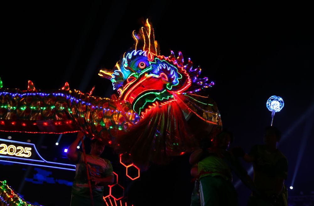 1月26日,演员在泰国那空沙旺湄南河畔举行的春节庆祝活动上表演舞龙。图源新华社