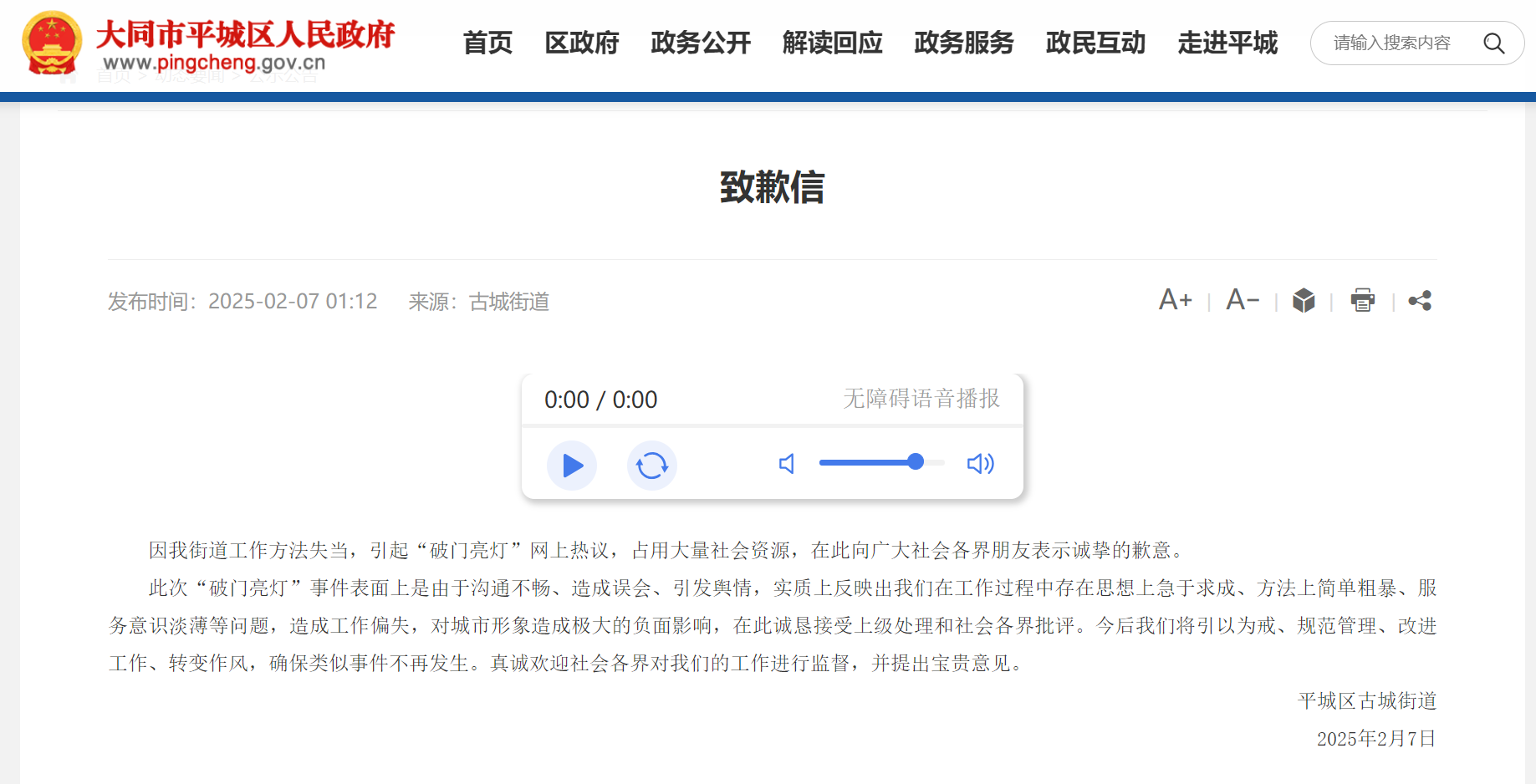 2月7日凌晨,山西大同市平城区政府官网发布致歉信,回应此前网友热议的古城街道“破门亮灯”事件。全文如下: