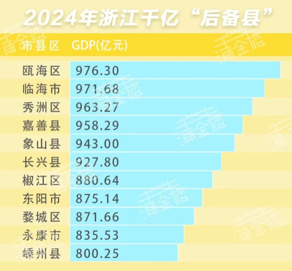浙江千亿县的“彩蛋”,还在候补队伍。明年具备冲刺千亿实力的县市区不少,如GDP超900亿元,有瓯海、临海、秀洲、嘉善、象山、长兴;GDP超800亿元,有椒江、东阳、婺城、永康、嵊州。从预备队的地区分布来看,金华、嘉兴、台州的占比较高,衢州、丽水和舟山三地依然还要加把劲。按照2025年浙江省经济社会发展的主要预期目标:地区生产总值增长5.5%左右。瓯海、临海、秀洲、嘉善,只要保持与全省相匹配的增速,次年都有可能迈过千亿门槛。至于象山和长兴,只要够努力,同样也有冲刺成功的可能。这意味着,明年千亿县的扩容速度只会更快。
