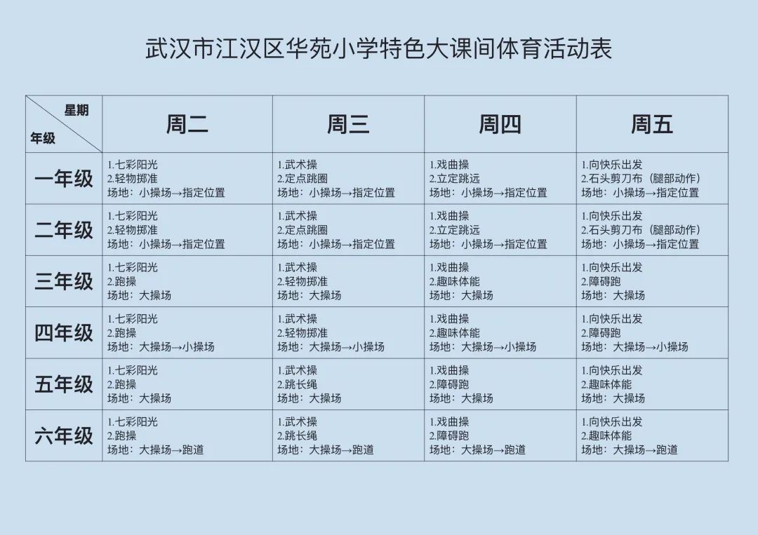 3 江汉区华苑小学大课间延长至40分钟,学生每周轮换做四套不同的广播操。学校还充分利用校园内的每一处空间,确保28个班级均能拥有各自专属的运动场地和项目。