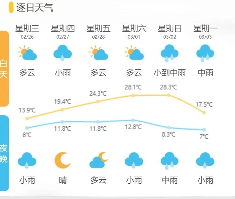 整体来说,未来5天浙江晴雨相间,明后天有弱降水过程;28日到3月1日有阳光现身;2日起阵雨增多。