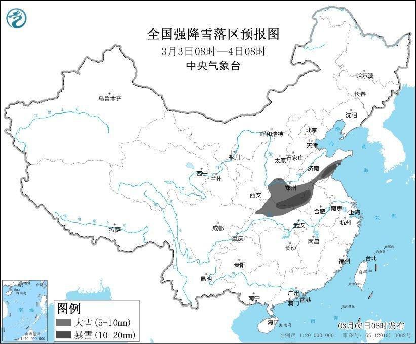 暴雪黄色预警:预计3月3日08时至3月4日08时,山东南部、河南中南部、安徽西北部、湖北西北部等地部分地区有大雪,其中,山东南部、河南东南部、安徽西北部、湖北西北部等地部分地区有暴雪。