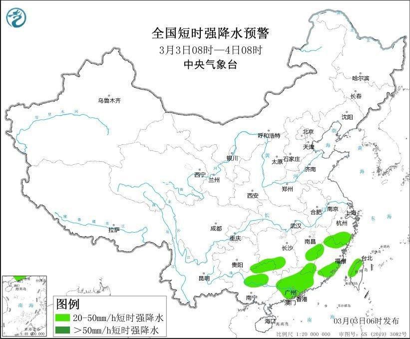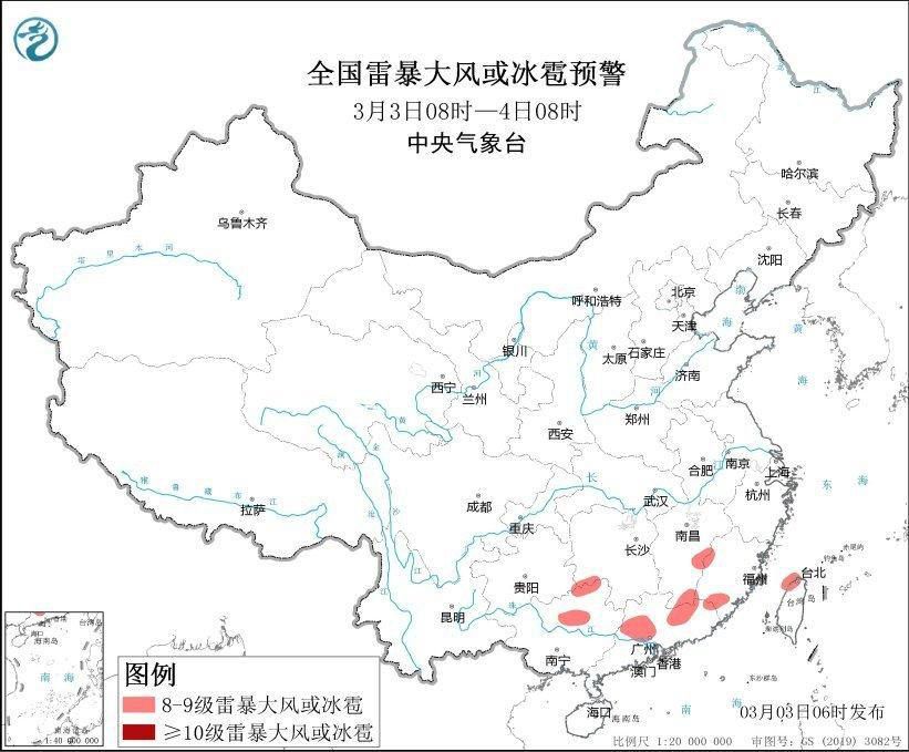 强对流天气蓝色预警:预计3月3日08时至4日08时,湖南西南部、江西东部和南部、福建西部和南部、广西东北部、广东中北部、台湾岛北部等地的部分地区将有8级以上雷暴大风或冰雹天气,局地风力可达10级;