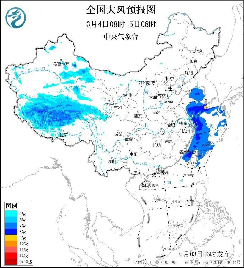 大风蓝色预警:预计,3月3日08时至4日08时,新疆南疆盆地和东部、西藏中北部、青海南部等地部分地区有5~6级风、阵风7~8级;