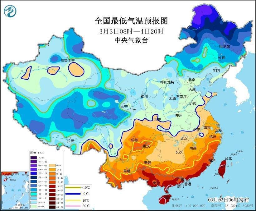 寒潮蓝色预警:受寒潮影响,预计,3月3日08时至3月4日20时,江淮、江汉、江南、华南北部和西部、西南地区东部等地气温将下降6~10℃,其中,江南中西部和东北部的部分地区降温幅度可达12℃以上。
