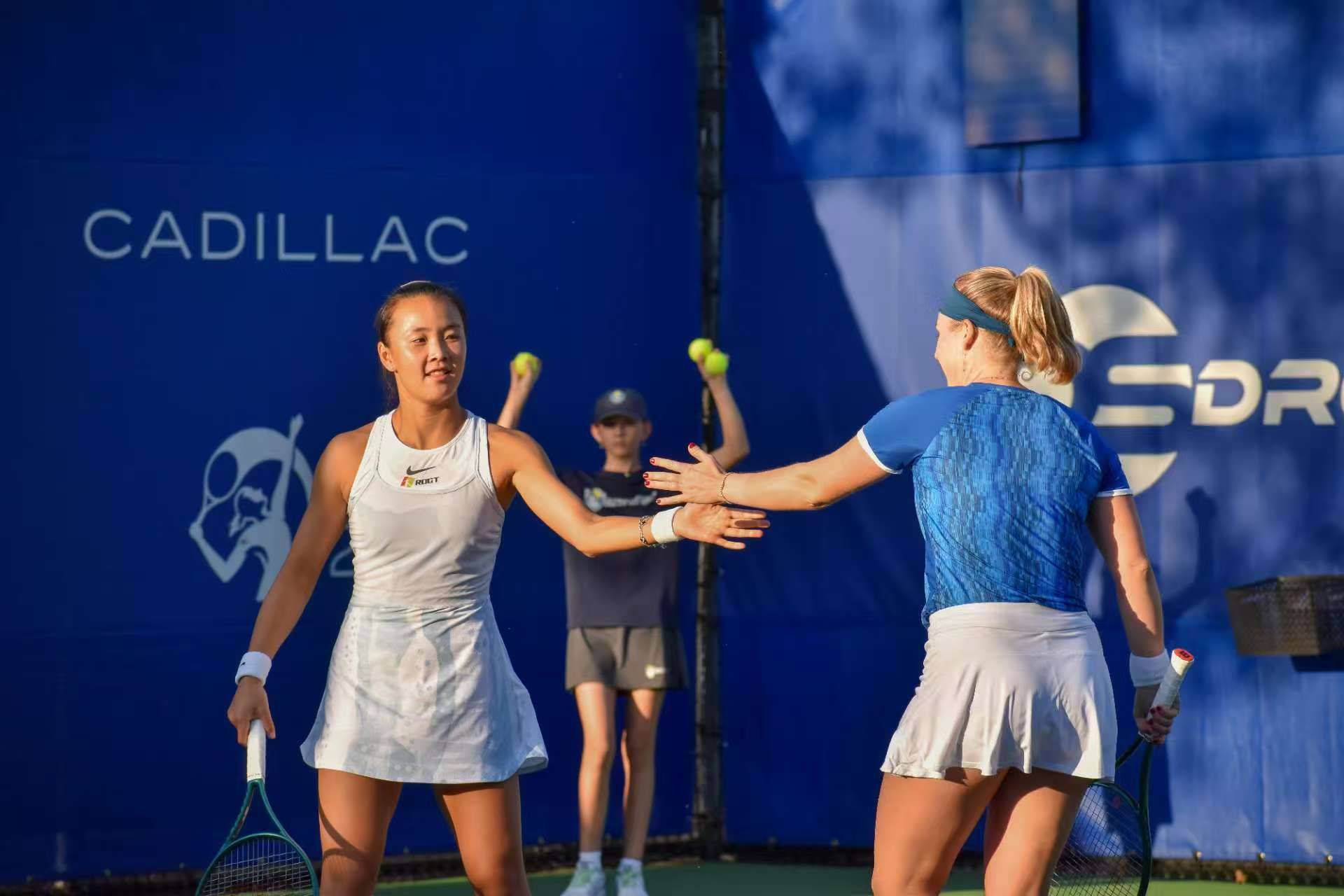 当地时间3月2日,在WTA250奥斯汀站双打决赛中,两位中国选手隔网相对。最终袁悦/布林科娃以3-6、6-1、10-4战胜张帅/凯斯勒,夺得冠军。
